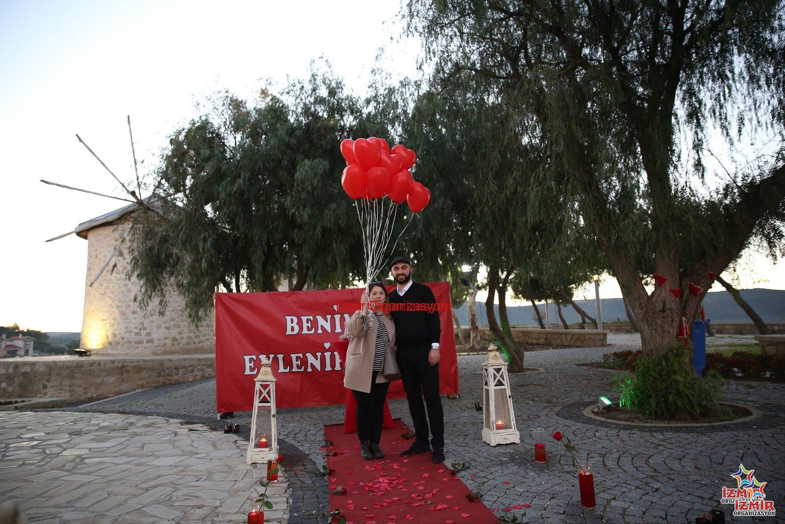 İzmir Organizasyon sorumlusu arkadaşımızdan hazırlıkların bittiği haberini alan Mustafa bey, Ayşe hanıma Çeşme’de otantik yel değirmenlerini dolaşmak istediğini söyledi. Yeni yılın ilk günüydü ve tüm hazırlıklardan habersiz olan Ayşe hanım Mustafa bey ile beraber organizasyon alanına doğru ilerlemeye başladılar. Çeşme yel değirmenlerinin otantik havası ile yazdan kalma ince lodosla kışın ayazını kovalıyordu. Harmanladığımız romantik bir konseptin planını genç çiftimiz için profosyonel şekilde kurgulamıştık. Alanında uzman ekip arkadaşlarımız sürpriz evlenme teklifi organizasyonumuzun başlama saatinden dört saat önce Alaçatı Değirmenler’ inde hazırlıklara başladı. Evlenme teklifi organizasyonun kusursuz olması ve sürpriz bir şekilde yapılması için bütün her şey planlanmıştı. Dolayısıyla organizasyon sorumlumuz Mustafa bey ile organizasyonun bulunduğu nokta ve saat konusunda belirli aralıklarla iletişime geçiyordu. Yel Değirmenler’ inin hemen önündeki Arnavut kaldırım yola, genç çiftimizin uzun bir ömür beraber yürüyecekleri evlilik yolunu simgeleyen bir yol oluşturulmaya başlandı. Bu hayallere sonsuz mutluluk penceresini açacak olan yol, belirli aralıklarla karşılıklı hizalarda yerleştirilen içi kandilli deniz fenerlerinin yerlerini alması ile başladı. Ardından her iki deniz fenerinin arasına yer volkanları yerleştirildi. Oluşturulan giriş yolu, karşılıklı yerleştirilen deniz fenerlerinin ortasına kırmızı halı serilerek tamamlandı.
