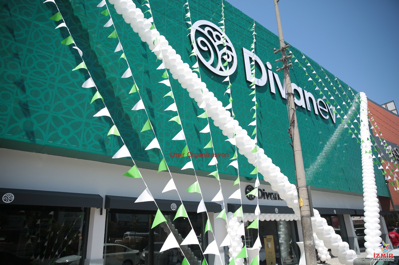 Divan Ev açılış günü gelip çattığında belirlediğimiz saatte, balon süsleme için İzmir Buca’da bulunan ofisimizde malzemelerimizi hazırlayarak son model aracımızla yola çıktık. Ofisimize yakın olan Karabağlar semtine ulaştığımızda hızlıca işe koyulduk. Firmanın kurumsal renklerini yansıtan beyaz ve su yeşili, dış mekanda boydan boya zincir balon ve bayrak süslemelerinde karar kılmıştık.