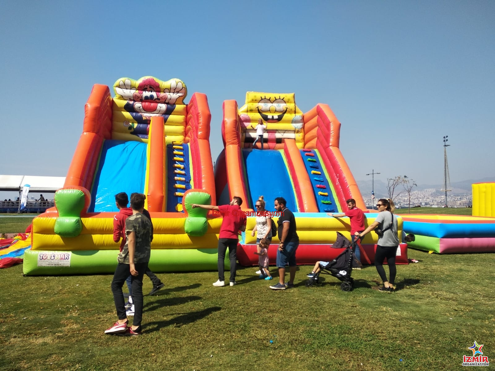 İzmir körfez şenliği organizasyonundan önce tüm ekipmanlarımız hazırlanmış ve son model araçlarımıza yüklenmişti. Organizasyon günü gelip çattığında İzmir Buca’da bulunan ofisimizden kalabalık bir ekiple yola çıktık. Sabahın ilk ışıklarıyla belirlenen lokasyona ulaştığımızda ise hiç vakit kaybetmeden hazırlıklara başladık. Dev palyaço kaydırak, sünger bob kaydırak, kuleli zıp zıp, kedili kombo zıp zıp gibi şişme çocuk oyuncaklarımız planlamalarımız doğrultusunda yerlerini aldı. İzmir körfez şenliği organizasyonu içerisinde sadece çocukları değil, yetişkinleri de gün boyunca eğlendirmeyi hedefledik. Rodeo, çekme basket, dev tırmanma dağı ve şişme oyuncaklarımızı Alsancak çimlerin üzerinde konumlandırdık.