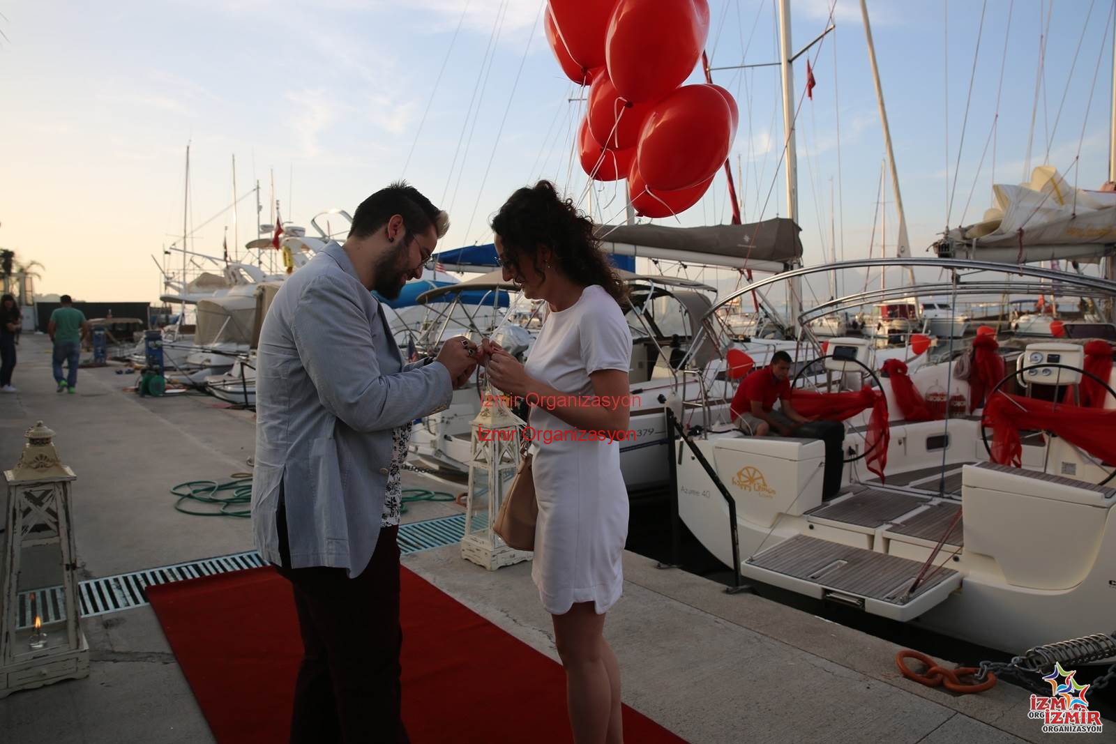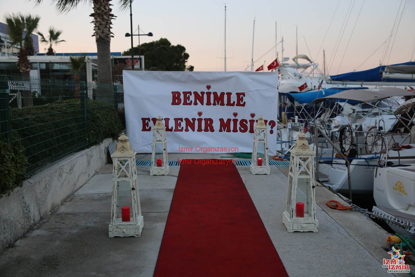 Kırmızı halıya yaklaştığınız her adımda heyecanın dozu artacak. Uçan balon buketimizi eş adayınıza hediye edeceğiz ve kırmızı halıya ayak bastığınız an sizin şarkınız çalmaya başlayacak ve “Benimle Evlenir misin?” yazılı pankart açılacak. Evlilik teklifinizi yaptığınız anda yer volkanları yanarak coşkuyu artıracak. Daha sonra marinada bekleyen balon ve tüllerle süslenmiş teknemize geçiş yapacaksınız. İzmir’in eşsiz manzarası eşliğinde muhteşem bir körfez gezintisine çıkacaksınız. Teknenin içinde sizleri bekleyen çeşitli atıştırmalık, meyve tabağı ve çerezlerle donatılmış masada eş adayınız da şampanyalarınızı yudumlayacaksınız. Yaklaşık 1 saat süren bu keyifli gezintiden sonra marinaya geri bırakılacaksınız. organizasyon süresince en güzel anlarınız fotoğraflanacak ve kamera kaydına alınacak. Daha sonra bu görüntüler seçtiğiniz bir şarkı ile size özel bir video klip haline getirilecek.