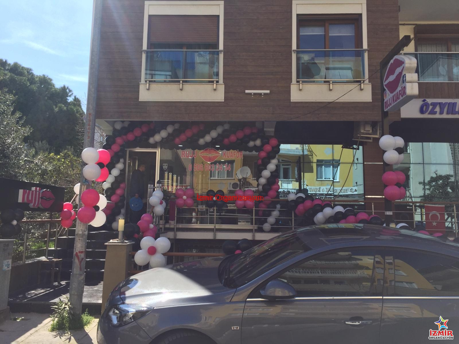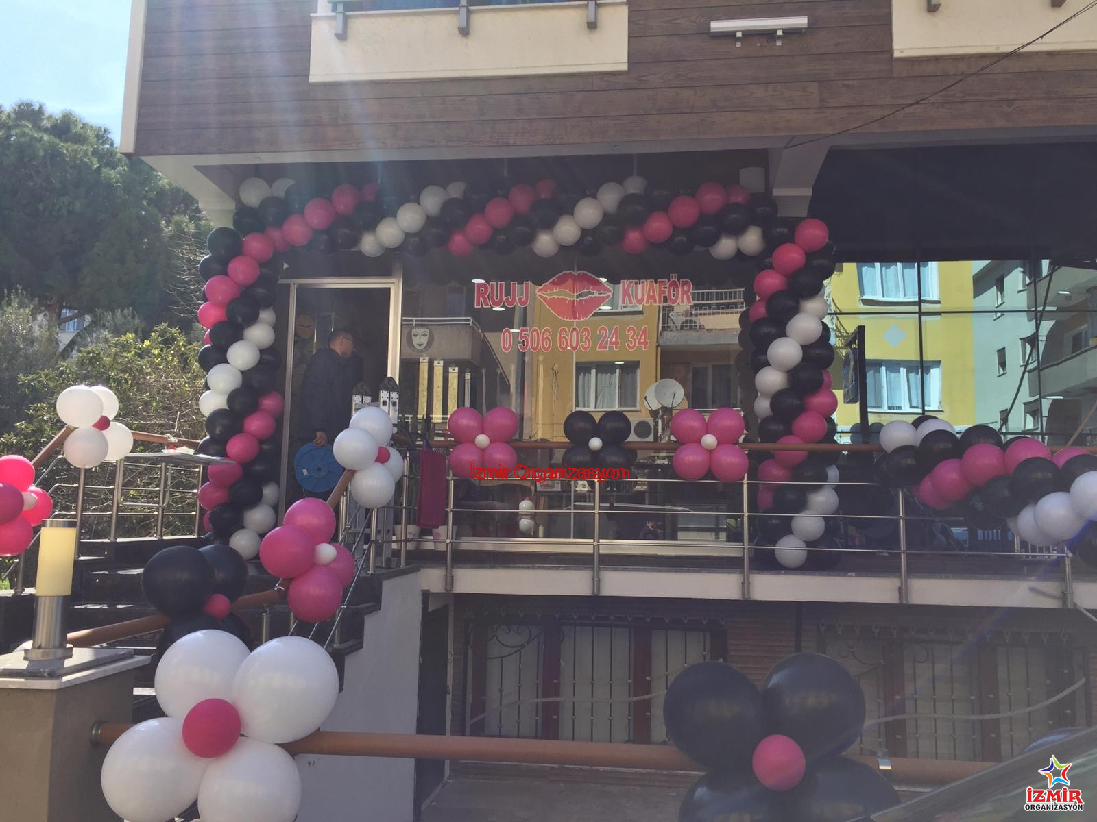 8 Mart Dünya Kadınlar Günü gelip çattığında belirlediğimiz saatte, Rujj Kuaför 8 Mart Dünya Kadınlar Günü balon süsleme için İzmir Buca’da bulunan ofisimizde malzemelerimizi hazırlayarak son model aracımızla yola çıktık. Yine aynı semtte bulunan Rujj Kuaför & Güzellik Salonuna ulaştığımızda hızlıca işe koyulduk. Firmanın kurumsal renklerini yansıtan beyaz, pembe ve siyah tonlarla, dış mekanda boydan boya zincir balon ve papatya balon süslemelerinde karar kılmıştık.